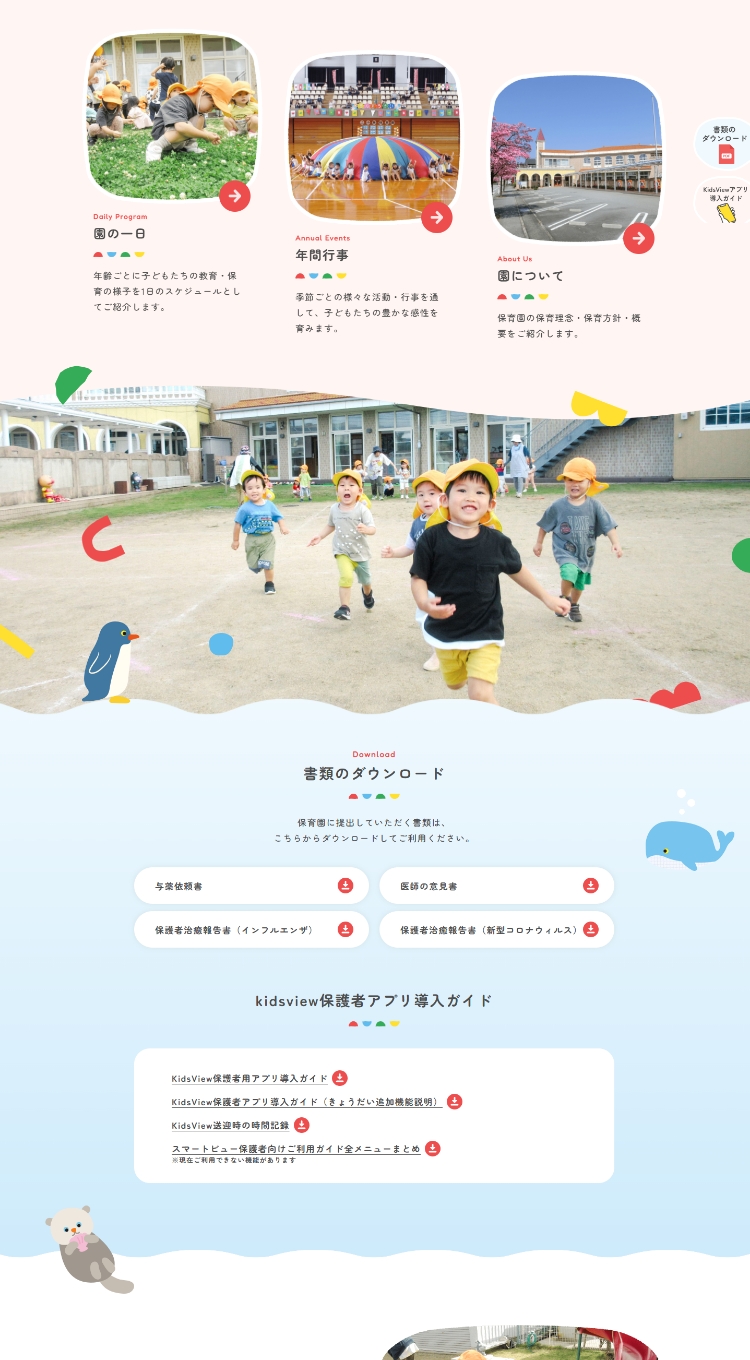 クラスごとの動物をイラストに起こし、子どもたちのにぎやかで楽しい雰囲気が感じられるサイトを目指しました。